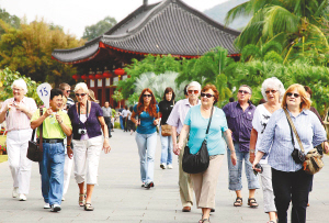 | 海南旅游“调结构、转方式”,在高端旅游消费模式的带动下,海南旅游总收入大幅增长。图为三亚南山景区迎来大批外国游客。