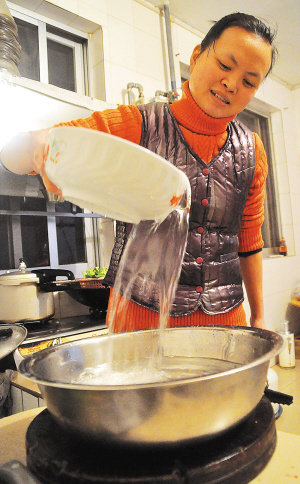 ←1月31日,广西柳州市柳长路一个居民小区的居民在打水准备做晚饭。