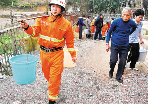 | ↑1月31日,在柳北区长塘镇西流村浪江屯,消防队员帮村民挑水。