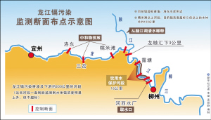 事故发生后,环保部门1月15日在龙江监测到镉超标80.5倍的峰值,也是此次污染监测到的最高超标峰值。经过处置,1月30日,镉超标最高峰值已下降到超标25倍左右,目前峰值位于宜州市境内的洛东水库附近。在柳州市区上游57公里的柳城县糯米滩水电站以上的龙江河段,目前有镉浓度超标5倍以上的水体长约100公里。