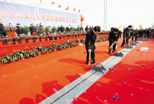 1月31日,出席合龙仪式的嘉宾敲入合龙销钉。 当日,目前国内跨径最大的双塔三跨悬索桥———南京长江第四大桥钢箱梁桥面合龙,大桥建设转入钢箱梁焊接、钢桥面铺装阶段,预计年底可建成通车。 新华社发
