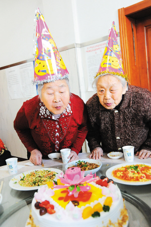 1月31日,黑龙江省哈尔滨市第一社会福利院为农历龙年出生的28位老人举行了一场集体生日宴会。这是两名“龙”老人在寿宴上许下龙年心愿。 新华社发