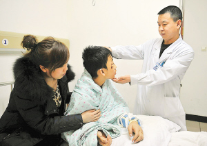 | 1月30日,医生检查坠楼男孩付佳伟的伤情。 新华社发 |