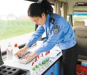 2月1日中午,在定安县定城镇龙州洋,为确保上市瓜菜农药残留不超标,定安县农业技术推广中心流动检测车现场对瓜菜进行检测,图为该中心工作人员正在对瓜菜样品进行检测。 本报记者 洪宝光 摄