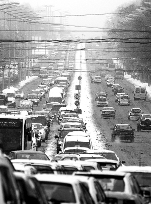 | 2月2日,在保加利亚首都索非亚,降雪导致交通拥堵。