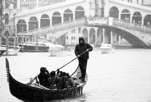 2月1日,在意大利威尼斯大运河上,一名船夫在飘落的雪花中运送乘客。 新华社/路透