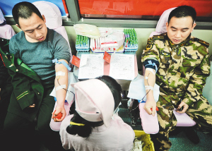 2月2日,消防官兵在献血。 目前,受季节性供血规律影响,湖南长沙血库告急,作为应急献血团体,湖南消防总队了解到这一消息后积极响应,组织了新兵团的500多名官兵在训练基地参加自愿无偿献血。 新华社发
