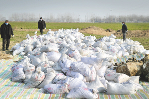 | 安徽省亳州市利辛县旧城镇丰桥村已关闭拆除的马桥轮窑场旁,当地环保部门组织专业工作人员将该处受污染的泥土全部统一装袋后进行无害化处理(1月7日摄)。 新华社发 |