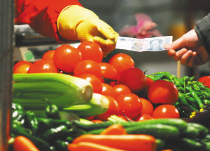 | 2月2日,市民在一家蔬菜摊位前交钱买菜。