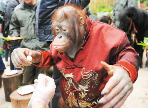2月2日,广州香江野生动物世界的一只红毛猩猩在享用特制的“汤圆”。 当日,广州香江野生动物世界的饲养员们专门为动物朋友们准备了特制“汤圆”,喜迎元宵节。 新华社记者 刘大伟 摄