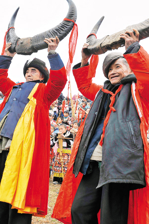 2月1日,苗族“寨老”抱着牛角在跳月活动上进行祭祀仪式。当日是农历正月初十,贵州省龙里县草原乡城兴村及相邻村寨的苗族同胞相聚跳月场举行跳月活动。新华社发
