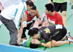 2月5日,在第16届香港国际马拉松赛中发生意外,一名26岁的男选手在冲过终点后倒地,当时就需要人工呼吸和心肺复苏急救。在被送往医院后,该选手被证实死亡。图为工作人员在对倒地选手进行救治。 新华社发
