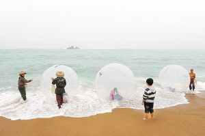 | ←春节期间,游客乘水上步行球在博鳌海滨戏浪。特约记者 蒙钟德 摄 |
