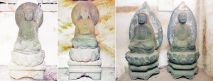 | 妹塔(左起)第3、2、1层塔心室里分别为陈隐、陈道叙祖师佛像和灵照、善长祖师佛像 |