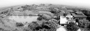 路的尽头堆放着并无任何刻意修饰的形态各异的奇石,站在大岩石上往下眺望,碧涛如画的林海中还夹杂着一道道如水波般流动着的纯白芦苇,大半个临高县城在薄雾的笼罩下显得格外的宁静、祥和。