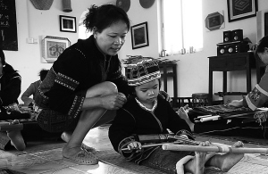 | 在五指山市番茅黎锦坊,4岁的黎族小姑娘李熙在黄慧琼(左一)手把手教授下学习织黎锦。 特约记者 尹秋艳 摄 |