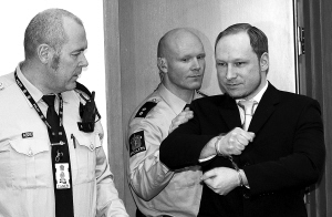 2月6日,挪威于特岛枪击案嫌疑人安德斯·贝林·布雷维克(右)在奥斯陆法庭出庭受审。 挪威于特岛枪击案嫌疑人安德斯·贝林·布雷维克的律师3日说,将向挪威最高法院提起上诉,以使他的当事人免于接受第二次精神鉴定。 新华社/法新