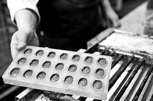 2月5日,在比利时首都布鲁塞尔一家巧克力店,工匠展示夹心巧克力坯。当日是比利时工匠日,玻璃制品、铸铁、家具、啤酒酿造、糕点、园艺等当地传统手工业的中小企业向公众免费开放。 新华社记者 叶平凡 摄