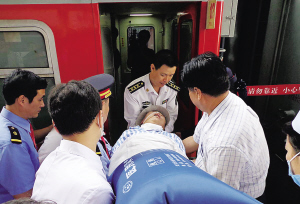 | 众人将患者万惠芬抬上火车。