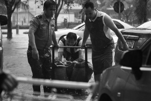 | ↑去年10月,海口市榆海华庭小区的保安冒雨帮助住户。