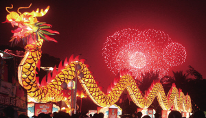 | 二月六日晚,海口万绿园焰火晚会,璀璨的烟花与长龙花灯交相辉映。本报记者 李英挺 摄