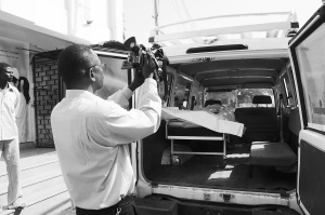 | 2月7日,在苏丹喀土穆华夏医院,苏丹电视台记者拍摄一辆救护车内的遇害中国工人遗体。 新华社发 |