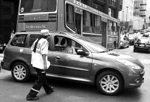 2月6日,在阿根廷首都布宜诺斯艾利斯,警察拦截试图进入市中心的私家车。 根据布宜诺斯艾利斯市政府的规定,从当天起除公交车、出租车以及在市中心有固定车位的车辆外,其余车辆在工作日的交通高峰时将禁止进入市中心。 新华社/美洲通讯社