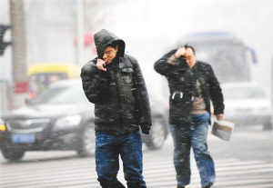 → 2月7日,行人在山东烟台街头冒风雪出行。 新华社发