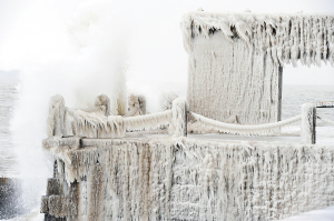 | ↑ 2月7日,山东烟台东炮台旅游码头的防护栏上结满海水冰凌。