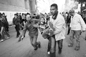 | 在埃及开罗解放广场附近,示威者运送一名伤员。 新华社发 |
