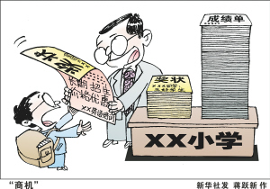 近日,一位网友在一家社区论坛上发帖子称,河南虞城县实验小学在今年寒假前发的学生奖状和成绩单背面印有两家英语培训机构的广告。该帖子随后被其他论坛和微博纷纷转发,引发热议。许多人表示,学校如果商业气息太浓,会影响孩子健康成长。 新华社发 蒋跃新 作