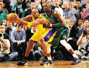 | 北京时间2月10日,在NBA常规赛中,湖人队客场以88:87击败凯尔特人队。图为科比和凯尔特人球员皮特鲁斯(右)争抢。 新华社发 |