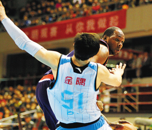 ←2月10日,在CBA第32轮比赛中,北京队主场击败佛山队。图为双方队员拼抢。 新华社发