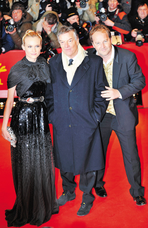 | 柏林电影节开幕影片《再见,王后》的演员迪安·克鲁格(左)、导演伯努瓦·雅克(中)与法国演员格扎维埃·博瓦亮相电影节开幕式红毯。 新华社发 |