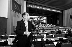 2月8日,吴可义正在大会现场拍摄。18年来,吴可义用手里的摄像摄影设备忠实记录了政协会议的点滴变化。 本报记者 张杰 摄
