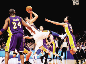 | 林书豪(中)在湖人球员的包夹中后仰投篮。 新华社发 |