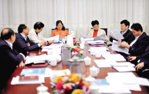 2月11日上午,出席省四届人大五次会议的保亭代表团在审议有关报告。 本报记者 宋国强 摄