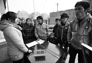 | 2月10日,浙江省温岭市瑞丰五福气动公司的招聘人员在厂门口现场招聘。该公司2011年员工工资增加了12%,今年计划增加15%,今年农历正月初八后每天都有大量的应聘者。 |