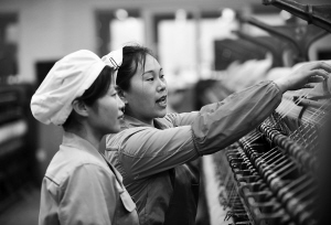 | 2月10日,浙江省宁波市镇海区一家纺织企业的细纱工周燕芬(右)在现场“授徒”。
