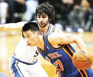 林书豪与西班牙“神童”卢比奥的对决,是尼克斯与森林狼之战的一大看点。图为林书豪(前)带球突破卢比奥的防守。 新华社发