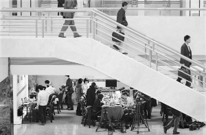 2月12日上午,政协海南省五届五次会议闭幕后,委员们陆续离开会场,而记者们依旧在现场忙碌。本报记者 张杰 摄