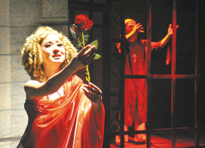 2月12日,北京一九九八国际青年艺术剧团推出的话剧《世界第一个情人节》在北京9剧场举行首场演出。本剧讲述了两千多年前古罗马一个美丽感人的爱情传说。 图为演员表演话剧《世界第一个情人节》。 新华社发