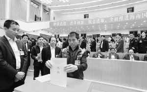 | 2月13日,海南省四届人大五次会议圆满完成各项议程,在省人大会堂胜利闭幕。图为代表在投票。