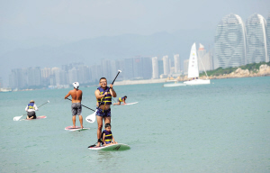 2月11日,游客坐着滑板在三亚湾上划水。沃帆赛的举行吸引了大量游客参与水上活动,令大量原本与大海十分陌生的游客有机会亲自体验一下海的乐趣。 本报记者 苏建强 摄