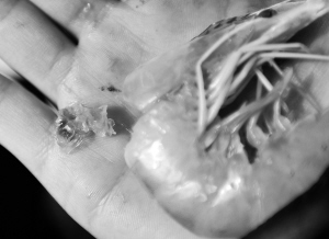 2月13日,记者从购买的“注胶虾”头部挤出胶状透明物质。 新华社发