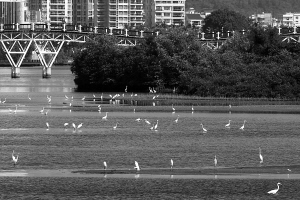 | 春天来临,在三亚河,成群的白鹭休闲觅食,点缀了美丽的三亚春色。 特约记者 孙清 摄 |