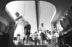 今天的训练内容主要是更换各种帆,在海上进行变向练习,以检验维护保养后的三亚号的各项性能。下午2点半,三亚号已经驶到海上,在离岸不远处等待记者到来。记者乘小艇登船后,两次沃帆赛冠军获得者、船长桑德森热情地打了个招呼后,只向三位记者说了三句话:“所有的绳索不能抓,站在船艉,衣服要穿上或系牢,否则会吹到海里。”三个小时的训练中,水手们之间的交流全部都是这样简短但非常明确的语句。