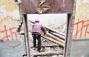 | 2月16日,一名工人在蒋介石“重庆行营”最后一层进行拆除作业。 新华社发 |