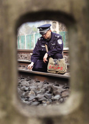 敬祥对铁路设施设备进行安全隐患检查(2月15日摄)。