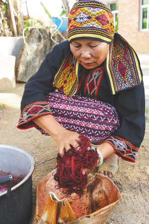 | ▲黎族妇女荣亚美在用一种乔木的槅煮水后为织锦染色。 张杰 摄 |
